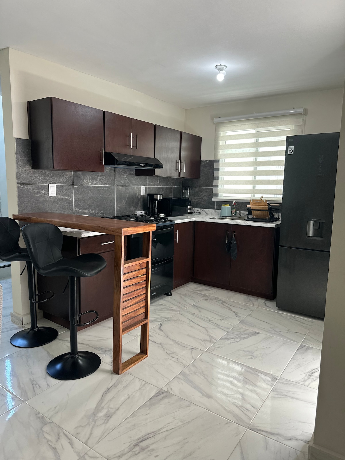 "Nuestro departamento esta a 5 minutos en carro de playa Miramar. Cuenta con cocina equipada con estufa, horno, licuadora, cafetera, utensilios básicos de cocina; Un baño completo con agua caliente. La habitación principal cuenta con MiniSplit, 1 camas matrimonial y una Queen sice y closet amplio. Otra habitación con una cama Quin Size (sin aire acondicionado) . Sala de estar con una pantalla de 40 pulgadas, WIFI, y tv por cable. terraza con asador, mesas y sillas.