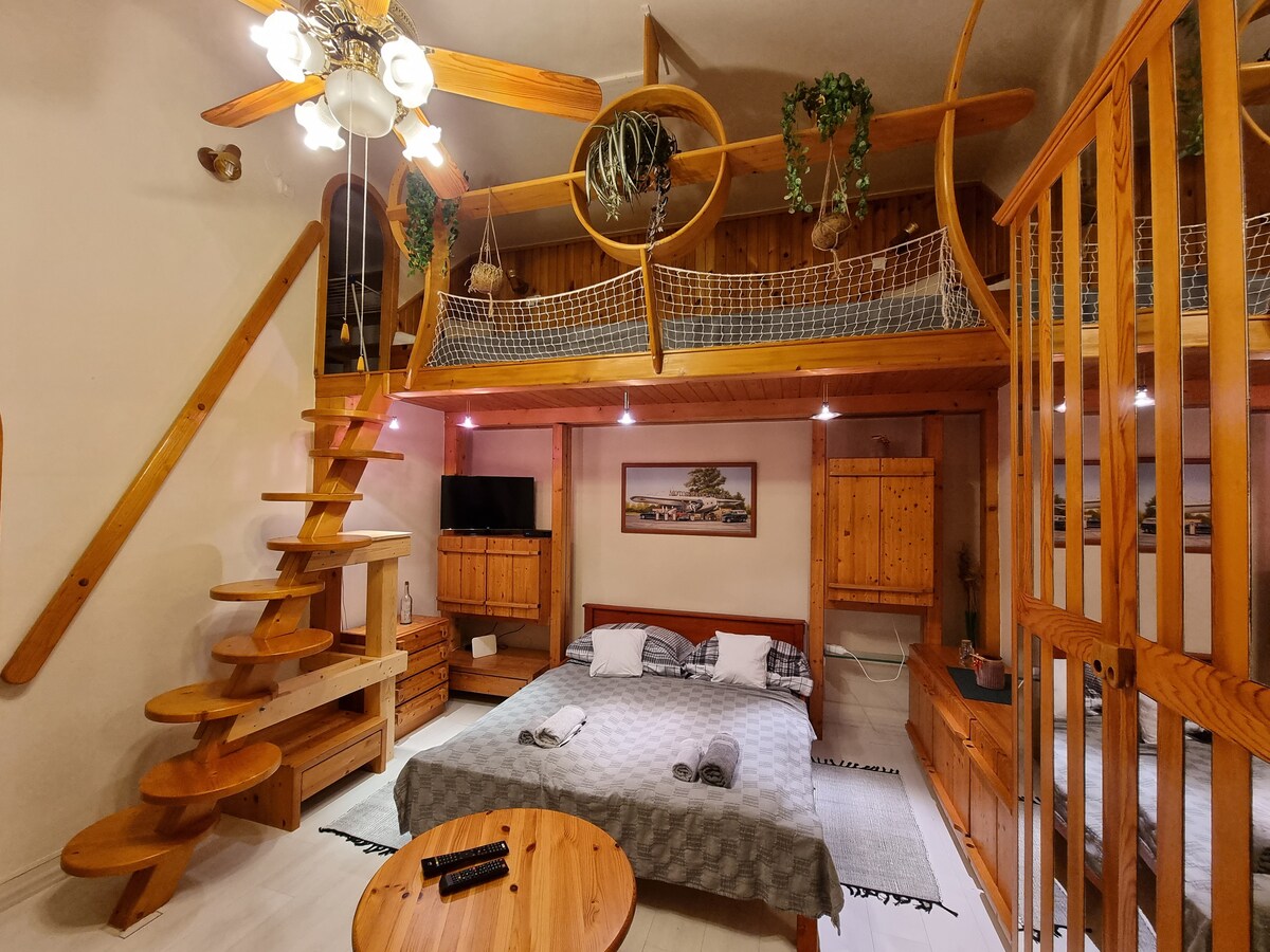 Czingu-LAK es un apartamento de galería de estilo único en el centro absoluto de Miskolc con un ambiente especial. Las unidades de dormitorio se encuentran en dos habitaciones separadas, en la galería de la sala de estar y en el dormitorio, para que puedas relajarte en plena ocupación. Se puede colocar una cómoda cama adicional en cualquier habitación.