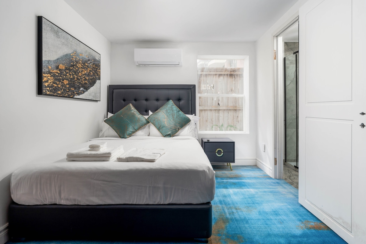 Bright, spacious suite with two private bedrooms featuring a King bed and Queen bed - ideal for couples, friends, or small families traveling together. Next door to Danforth Music Hall and steps from the restaurants, cafés, bars, and shops of Greektown. Broadview subway station is just a 200-metre walk away for easy TTC access across Toronto. Suite #3 at Danforth Hotel includes self check-in, A/C, fast Wi-Fi, a Samsung Smart TV with streaming apps, and a well-equipped kitchenette.