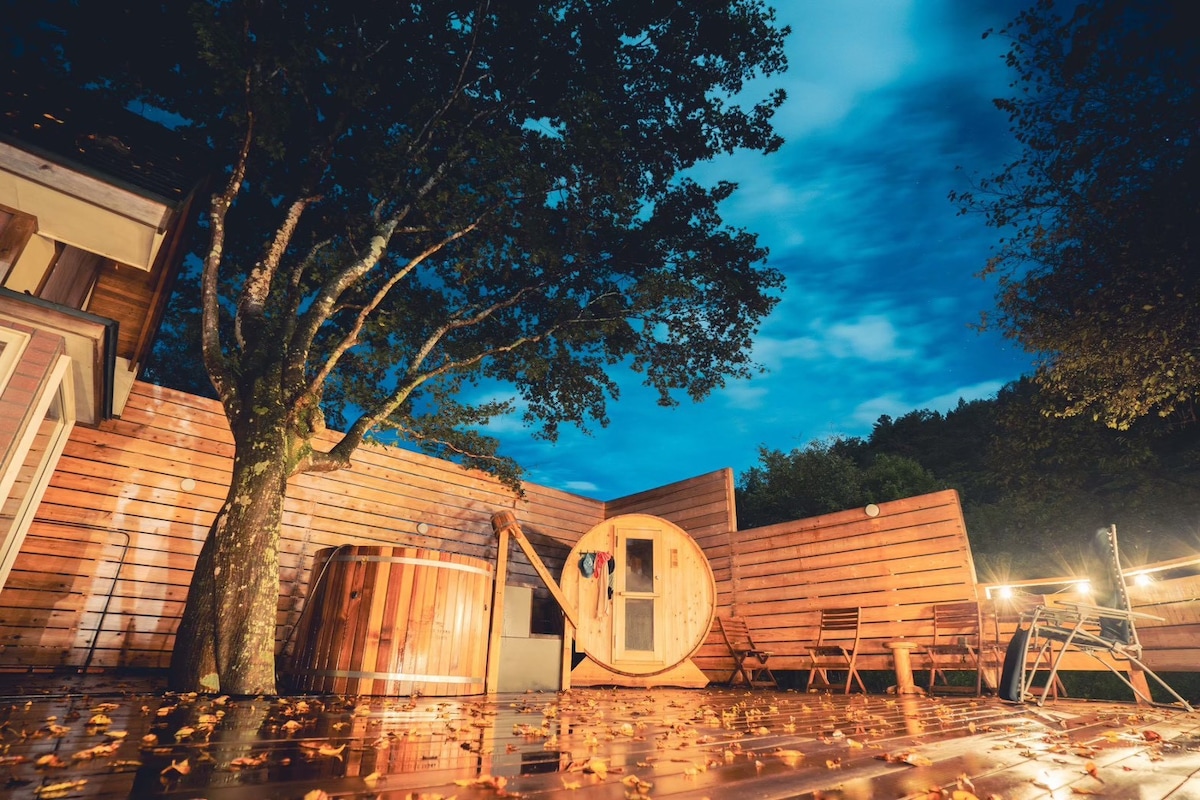 Abraza y corazón por naturaleza. Sauna Cottage Akiu es un espacio de sanación privado y privado donde la naturaleza de Sendai y Akiyo se mezcla con la sauna. A unos 40 minutos en auto del centro de Sendai. En la tierra de Akiu, llamada "Sendai's Okuzashiki", la cabaña de sauna Akiu es una casa de alquiler que se siente como un escondite. La posada está equipada con una sauna finlandesa. Puedes ajustar la temperatura y la humedad a tu gusto, así como un baño de refrigeración seleccionado por los entusiastas de la sauna. Puedes disfrutar de tu propia receta. Uno de los encantos de esta posada es que en las noches de verano, se puede disfrutar del cielo estrellado que se extiende por el cielo. En la naturaleza tranquila, el cielo estrellado mientras te refrescas después de la sauna es excepcional. Rodeado de "Santuario Akihabo", que consagra al dios de la suerte, y "Akihabo Otaki" con hermosas hojas de otoño, También hay muchos restaurantes donde puedes disfrutar de platos hechos con ingredientes locales. También es una base ideal para hacer turismo y alojamiento.