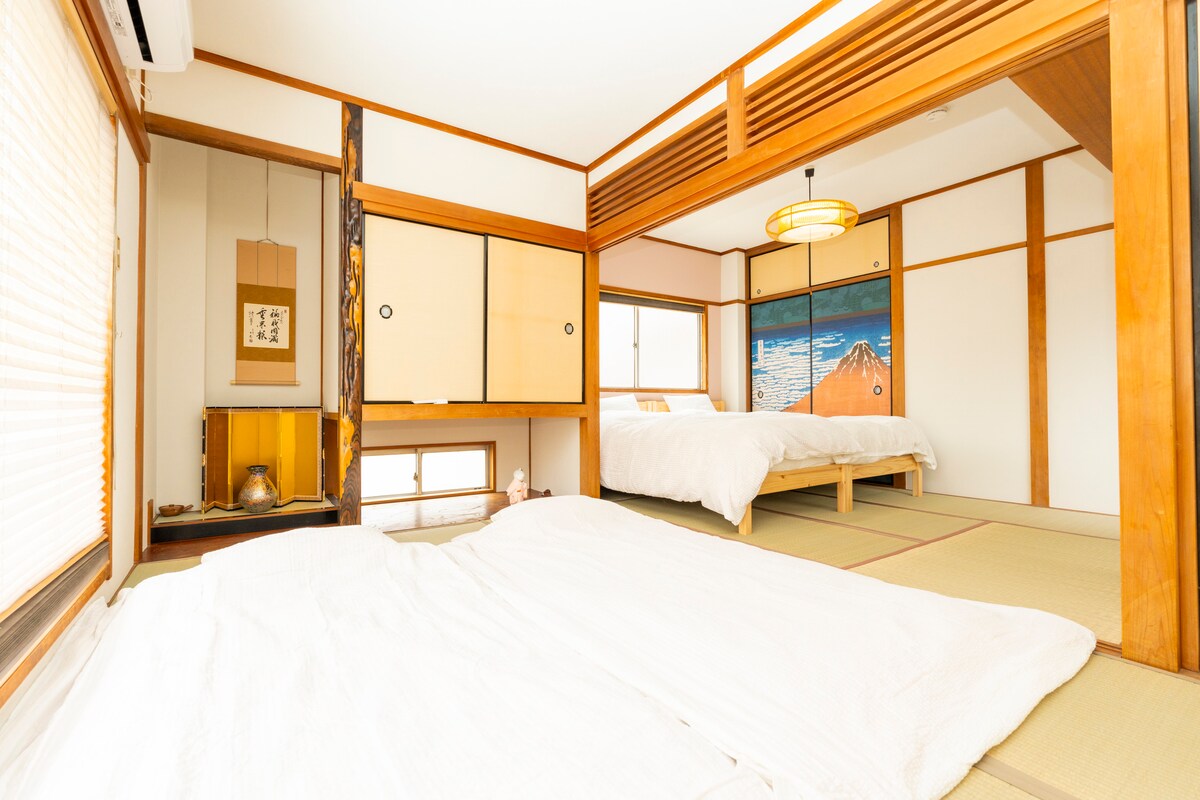 Ubicada en Joto Ward de Osaka, esta casa histórica de 1909 es un raro sobreviviente de la Segunda Guerra Mundial. Renovado en 2015 por un reconocido diseñador, abarca 150 !, mezclando el encanto histórico con el lujo moderno en un tranquilo refugio en el centro de la ciudad. Su elegante diseño armoniza el pasado y el presente, ofreciendo inmersión cultural y comodidad espaciosa. Con dos baños, inodoros separados, lavabos y un baño grande, garantiza privacidad y limpieza para grupos. Experimenta la cultura, la historia y la comodidad que te espera tu estancia perfecta en Osaka.
