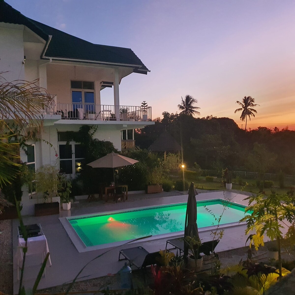 Maneri Villa offers a peaceful retreat on a developing coconut and fruit plantation. The property is a 5-minute walk from the beach used by local fishermen, with stunning sunset views, it has a large 8x4m pool, and lush surroundings. The villa has separate upstairs and downstairs units, flexible for larger groups. It operates off-grid with modern amenities like a fully equipped kitchen, high-speed WiFi and Smart TV with Netflix. 24/7 concierge support and local tour guides are available.