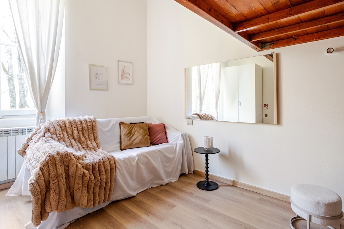 Espléndido loft con bóvedas de ladrillo visto, situado a dos pasos de la Mole Antonelliana y de la Piazza Vittorio Veneto, en una posición estratégica para visitar a pie todo el centro de la ciudad. El apartamento tiene una cama doble y un sofá cama, una cocina equipada, un baño, un vestidor y una lavandería. En el exterior, un patio verde privado donde se puede almorzar o relajarse en un entorno tranquilo y silencioso.