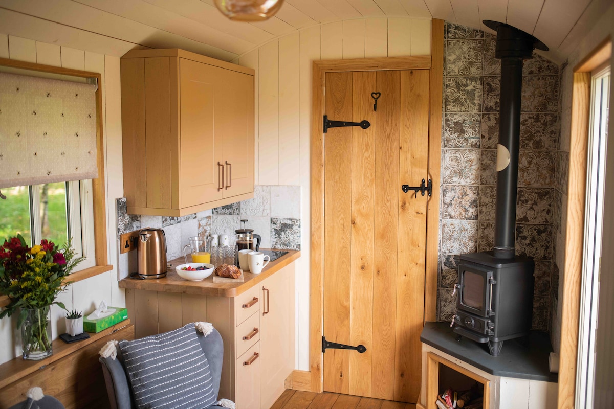 Carromato de lujo en la zona rural de Herefordshire. Un refugio perfecto para escapar y relajarse, la acogedora cabaña ofrece impresionantes vistas a la campiña de Herefordshire. La cabaña tiene una cama doble de tamaño completo y una estufa de leña para esas noches más frías. Junto a la cabaña hay otro edificio con carácter que cuenta con una ducha de cascada de lujo, inodoro con descarga y toallero con calefacción. También se proporcionan toallas mullidas. También hay una cocina bien equipada que incluye una cafetera Nespresso.