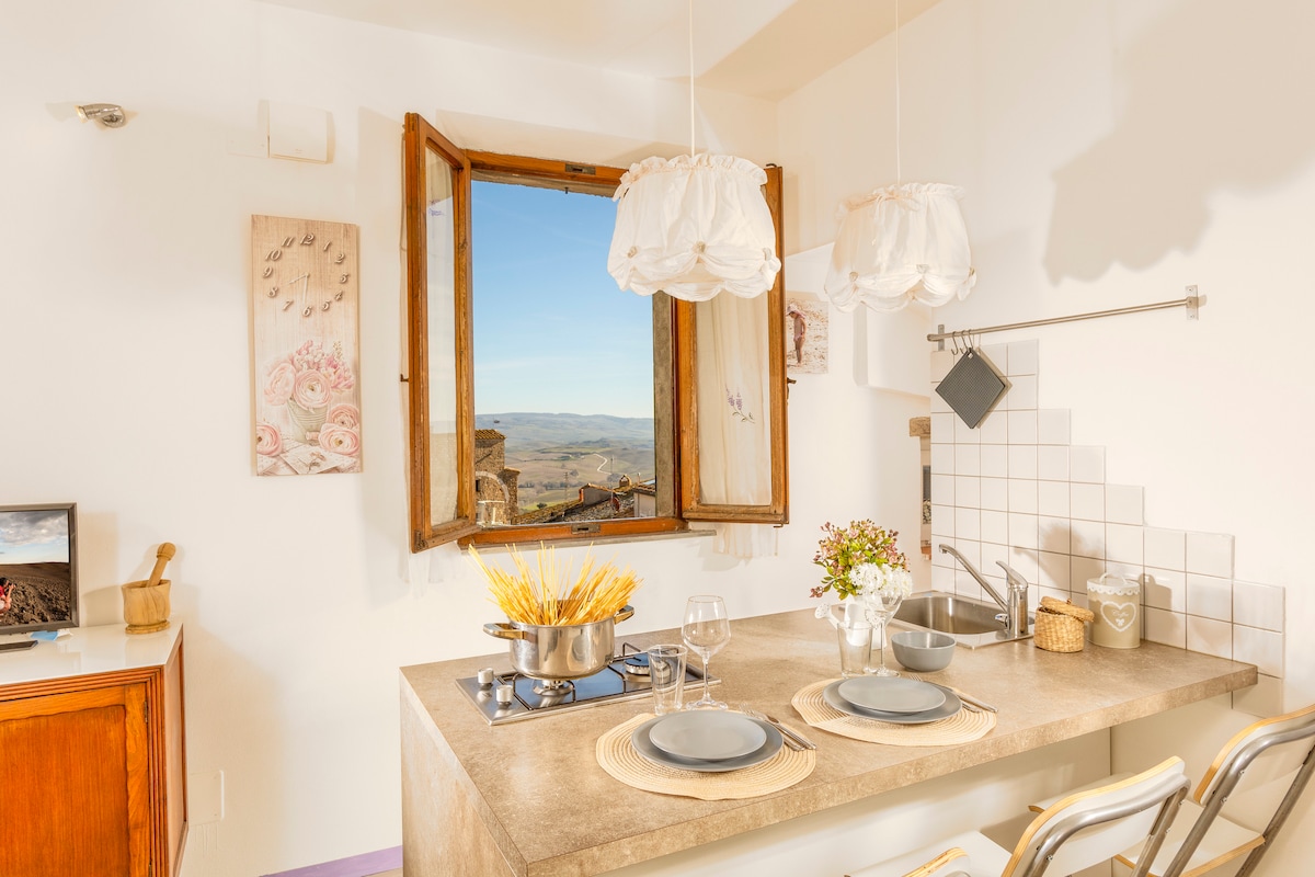 Un alojamiento completamente independiente recientemente remodelado, desde el diseño hasta el mobiliario, directamente por el anfitrión. Se compone de una sala de estar con una cocina totalmente equipada y un dormitorio con baño. La peculiaridad de la propiedad es la ubicación extremadamente favorable en el centro histórico, con una espléndida terraza con jardín panorámico en la Val d'Orcia, con barbacoa, hamaca, lavabo y ducha exterior.