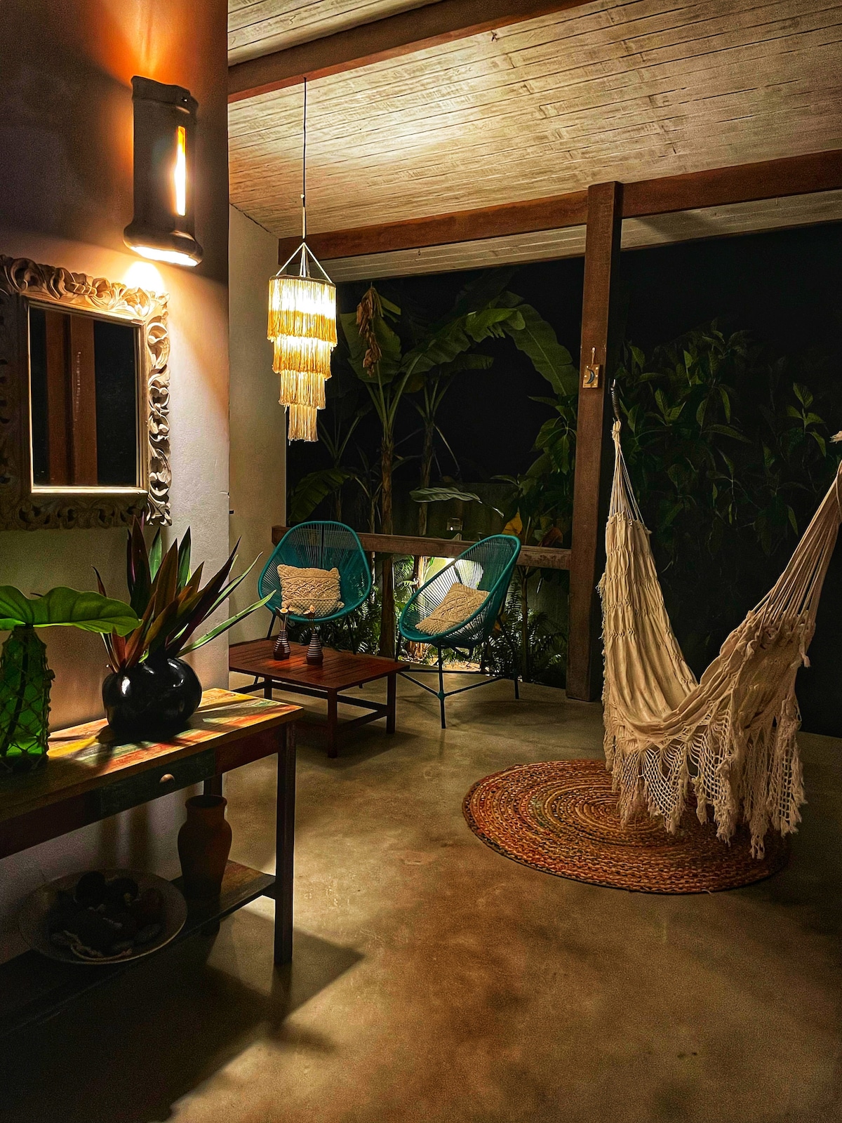 A Casa Céu reúne elegância, conforto e leveza em ambientes amplos, iluminados e naturalmente ventilados. A suíte oferece cama queen-size, ar-condicionado, closet, banheiro com chuveiro quente e um espaço exclusivo para trabalho. A cozinha espaçosa integra-se harmoniosamente a casa e a sala de jantar à noite ganha um clima romântico. O grande destaque é a área externa, com uma banheira rodeada por um lindo jardim perfeita para relaxar e se conectar profundamente com a natureza.