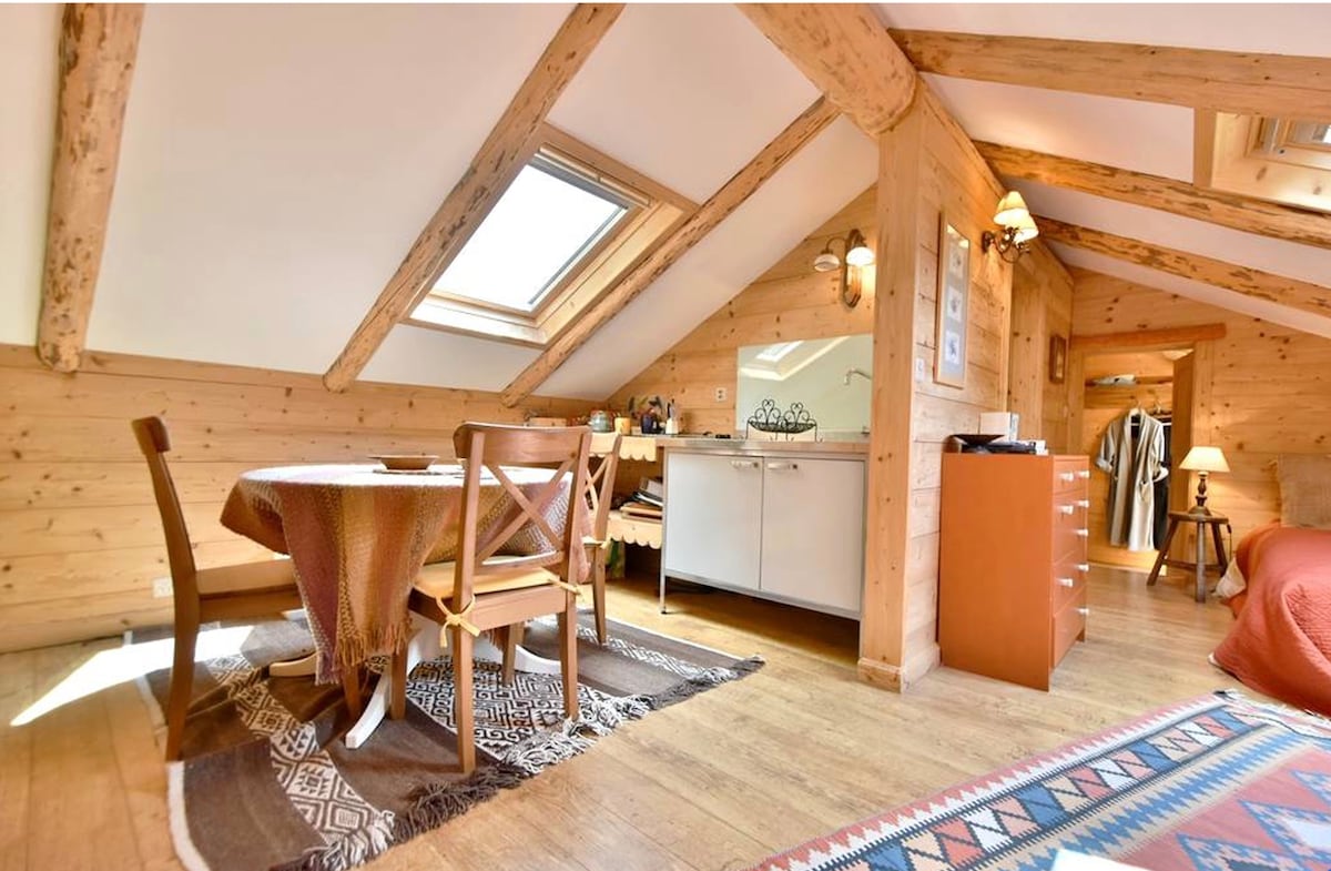 Este apartamento se compone de la siguiente manera: - Un hermoso espacio para vivir en el ático (dormitorio/sala de estar) con zona de estar de 2 sillones - Una cocina equipada: 2 placas de cocción, utensilios de cocina, microondas, parrilla, hervidor de agua, cafetera, mininevera con espacio para congelador, vajilla y cubiertos, aparato de raclette para 2 personas - Una sala de ducha+wc - Acceso independiente - 1 plaza de aparcamiento Puesta a disposición del garaje/sala de calderas para almacenar esquís, zapatos, bicicletas, ropa de esquí, etc.