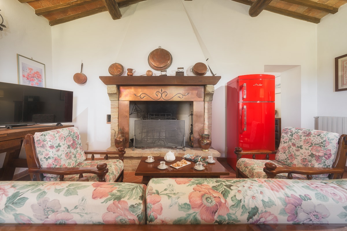 Sírvete una copa de vino y siéntate junto a la chimenea de este espacio abierto con un cálido ambiente típicamente toscano: vigas de madera, suelos de terracota y paredes de piedra. Luego sal y admira el magnífico panorama del Valdichiana. Sírvete una copa de vino y siéntate junto a la chimenea de este espacio abierto con un cálido ambiente toscano: vigas de madera, suelos de terracota, paredes de piedra. ¡Disfruta y relájate! Luego sal y admira la magnífica vista del Valdichiana.