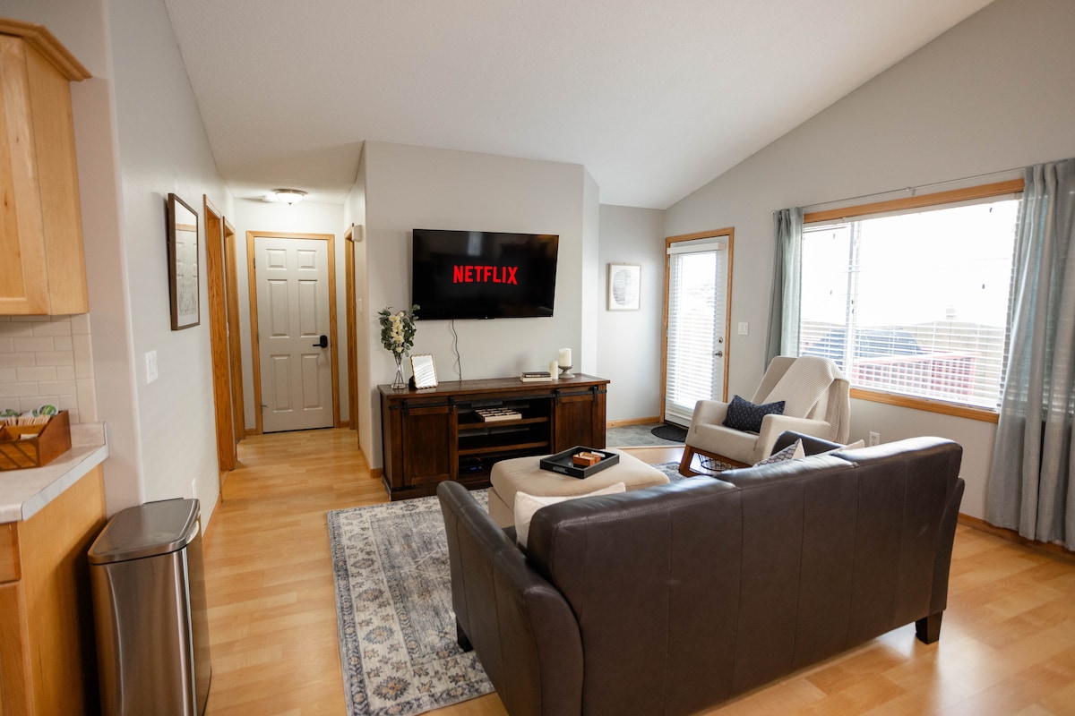 Da la bienvenida a todo Fargo. Este espacio de arriba está completamente actualizado en una encantadora casa de 2 pisos. A 5 cuadras de NDSU, a 5 millas del aeropuerto y, literalmente, a 2 minutos en coche del centro. Una cama tamaño king en el dormitorio 1; dos camas individuales en el dormitorio 2. No hay nada lejos cuando estás en Fargo. Ven a pasar el rato o utiliza esto como base de operaciones mientras disfrutas de la escena musical y artística del centro de la ciudad, disfruta de un evento deportivo o asiste a una obra de teatro. Wi-Fi + TV por cable Nota: La unidad de abajo también está disponible para alquiler.