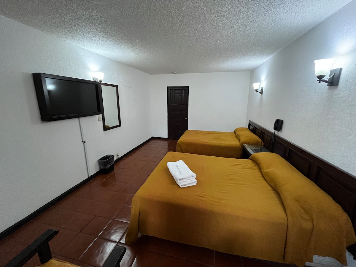 Habitación amueblada con 2 camas Queen, smart tv, con vistas al patio interior, adaptada para personas con capacidades diferentes (sin escalones, barras de apoyo en wc, banco en regadera). Disfruta de una noche cómoda y acogedora en el centro de Morelia. A 50 pasos de la Av. Madero (avenida principal)