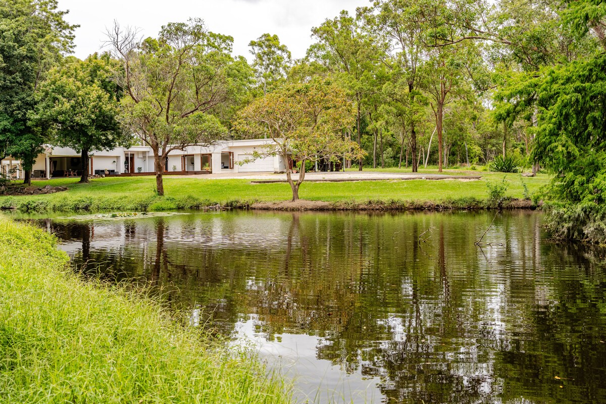 ¡Nuestro retiro recién renovado ya está disponible! Esta propiedad privada de 5 dormitorios, 2,5 baños tiene capacidad para 10 personas y está situada en el campo en las hermosas montañas Glass House. El retiro ahora incluye piscina, cancha de tenis, cocina de lujo, baño privado y piano de cola, así como muchas terrazas al aire libre para disfrutar del hermoso pais de montaña. Mantente ocupado o elige relajarte. Aunque te sentirás lejos, en realidad, solo estarás a 3 minutos de las tiendas locales, a 10 minutos del zoológico de Australia y a 30 minutos de Caloundra.