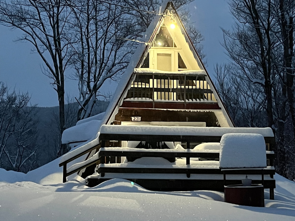 Cabaña privada con estructura en A en Alpine Village, Warren, Vermont. A 10 minutos de Sugarbush Resort, a 20 minutos de Mad River Glen. A una milla del hermoso lago Blueberry y cerca de Warren. Dormitorio completo y loft para dormir arriba con 2 camas individuales. Camino de tierra muy tranquilo y silencioso con vistas parciales orientadas al este hacia Roxbury Range. Se requiere 4x4/AWD de noviembre a abril con neumáticos decentes, no se recomiendan coches de poca distancia al suelo. ¡Cualquier pregunta o solicitud, por favor, pregunta!