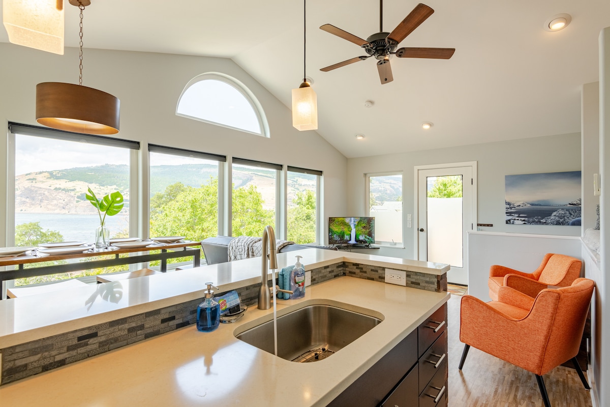 Brillantes vistas a la garganta del río Columbia con accesorios y acabados actualizados creados para niveles iguales de estilo y comodidad. Apartamento ecológico con paneles solares, suelos de madera de bambú y unidades de calefacción/aire acondicionado para controlar la temperatura. Cerca de todo lo que la garganta tiene que ofrecer: ciclismo, senderismo, degustación de vinos, diversión en el río y actividades en la nieve. Estamos muy cerca del tren y la autopista, se oye ruido desde la sala de estar, pero muy limitado desde el dormitorio.