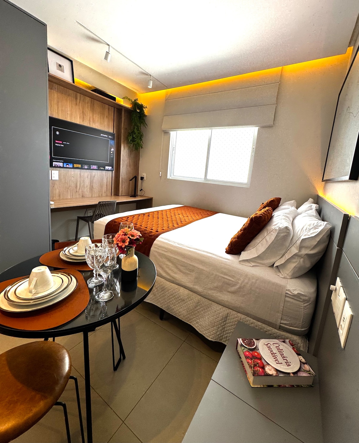 Estudio funcional ubicado en el corazón de la ciudad. Equipado con muebles nuevos. El condominio cuenta con espacios comunes, que son: Gimnasio, Sala de Estudio, Espacio Café, Bicicletero y, en el ala comercial, minimercado, farmacia y Tiendas funcionando. Frente al Cidade Atacadão, a pocos metros del Partage Shopping y muy cerca de los principales bares y restaurantes de la ciudad. Ubicación segura con conserjería 24h. Cuenta con estacionamiento rotativo y privado.