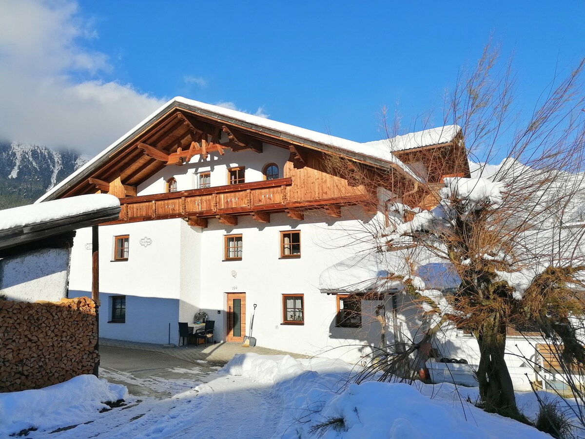 Estimados huéspedes: Bienvenidos a la meseta de Mieming en Obsteig, a 1000 m de altitud. Estaremos encantados de recibiros en nuestra casa familiar tradicional de 500 años, donde donde les esperan aventuras para grandes y pequeños. Jardín, estanque, chimenea, sala de pino cembro y ventana salediza. En sus 180 m², todos encontrarán su lugar favorito. Abran la puerta, entren, huelan la chimenea de leña y siéntanse como en casa.