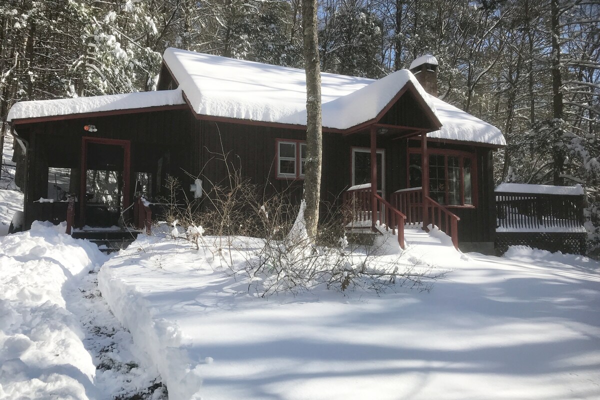 Our secluded classic cabin on 1.5 acres will restore, relax, & energize. Seasonal activities include skiing, hiking, antiquing, and/or just enjoying peaceful nature. 16 min to Hunter Mt, 24 min to Belleayre, 8 min. to Phoenicia, 25 to Woodstock. Kick back beneath the cathedral ceiling, gaze on woodland views by a crackling fire, burrow into bed & enjoy deep, restful sleep. Perfect for singles, couples, or families looking to connect with Nature but still be able to connect to Netflix.