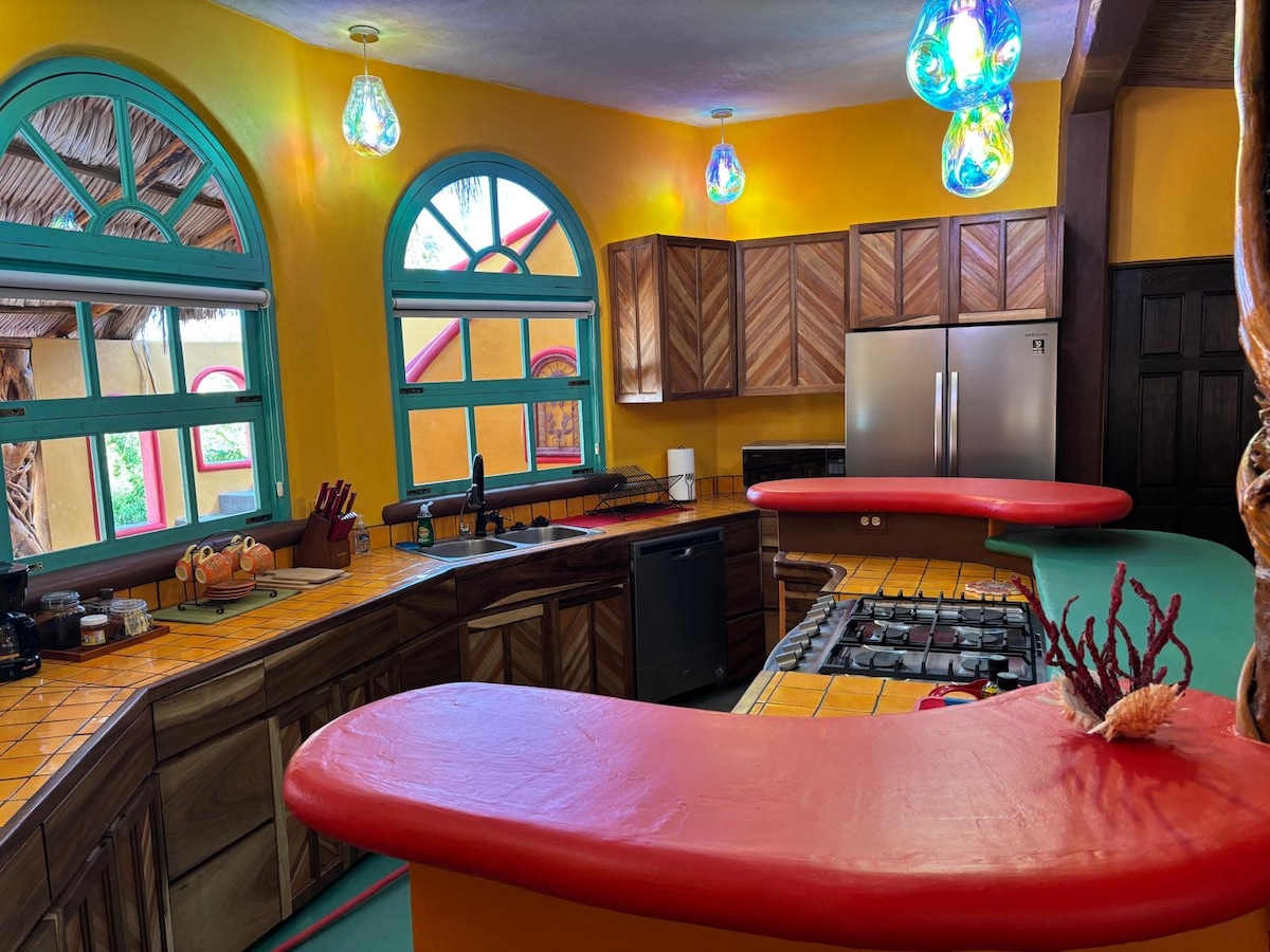 Forget your worries in this spacious and serene space. Just completed luxurious splendor! Enjoy the 550sf tiled patio with fabulous brick and stone fireplace/bar b que kitchen while watching the fishing boats return with the catch of the day. You can literally walk over and buy a kilo or two. Two large bedroom suites, a gourmet kitchen, handcrafted cabinetry, tasteful use of stone and glass throughout, natural sunlight, Lennox mini-split AC, Starlink internet.