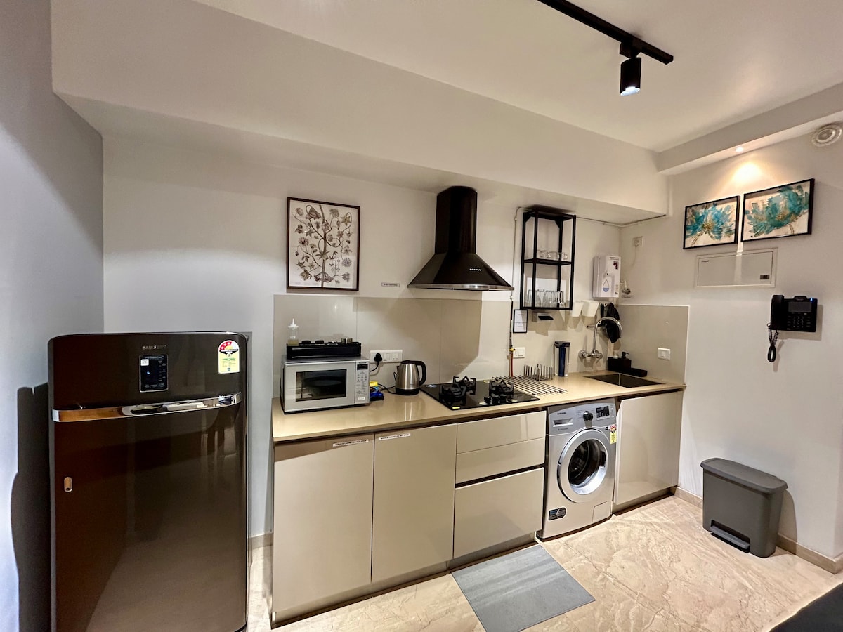 Bienvenido a nuestro estudio con temática de Nueva York en Hiranandani Estate, Thane, que aporta un ambiente urbano y un diseño elegante a tu estancia. Disfruta de una lujosa cama, sofá cama, Smart TV, wifi, cocina completa, lavadora y servicio de limpieza diario. Artículos de tocador, toallas lavadas con vapor y seguridad cerrada 24/7 incluidos. A solo unos pasos de cafeterías, restaurantes y «The Walk». Perfecto para viajes de trabajo, tratamientos o una escapada urbana.