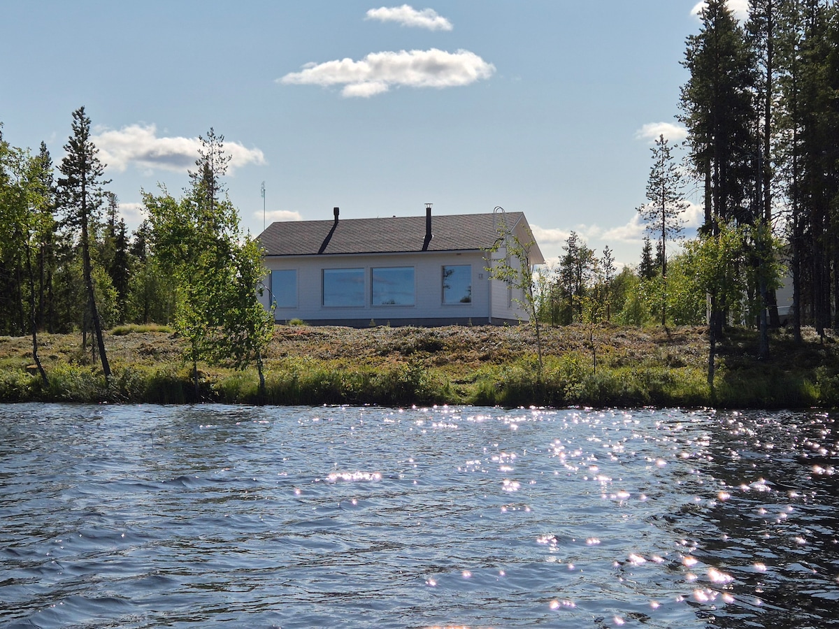 Nueva casa de vacaciones en una excelente ubicación junto al lago sin vecinos cercanos, pero cerca del centro de la ciudad y los servicios. Admira las montañas Olos y Pallas desde las ventanas panorámicas. A medida que cae la noche, disfruta del esplendor de la chimenea y de las luces danzantes de la aurora. Relájate en el patio escuchando el arroyo o rema en el lago bajo el sol de medianoche. Aquí puedes respirar el aire más limpio del mundo. Se puede acceder a las pistas de esquí de fondo y a los senderos de verano desde el patio. Bienvenido a Tunturi-Lapland. La limpieza y la tranquilidad son el mejor lujo.