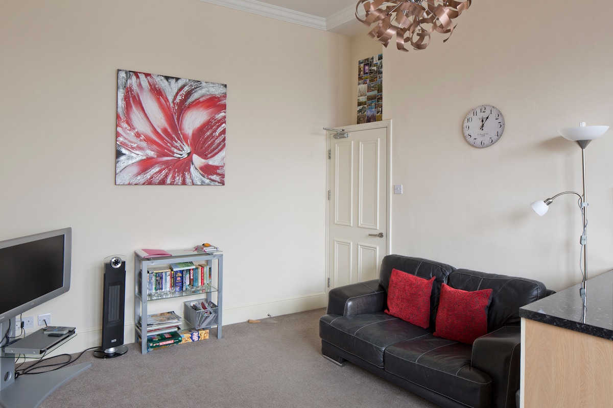 Sunny studio, separate cosy sleeping space, small double bed, and memory foam mattress. Perfect for a couple but it also has a sofa bed (£20 extra bedding) in the living room. New kitchen and bathroom. 3rd floor of a lovely converted hotel. No lift. Dogs are welcome, bring their bed, feeding bowl, and towels, and let us know that you are bringing your pet so that we can ensure soft furnishings are changed for any guests with allergies. Please do not allow your pet onto the bed or furniture.