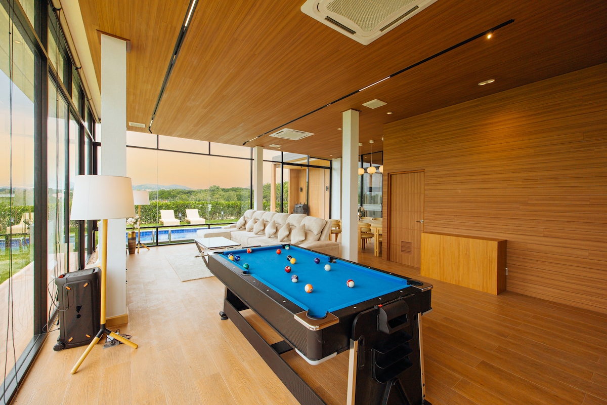 Esta casa de madera única hecha a medida con materiales importados y decorada con buen gusto con muebles de estilo rural y ropa de cama tiene unas vistas impresionantes del Parque Nacional Khao Yai "Big Mountain". Tendrás acceso completo a todas las instalaciones deportivas y recreativas del exclusivo Toscana Valley Golf & Country Club, como piscinas, pista de ciclismo, gimnasio, parque infantil, etc.