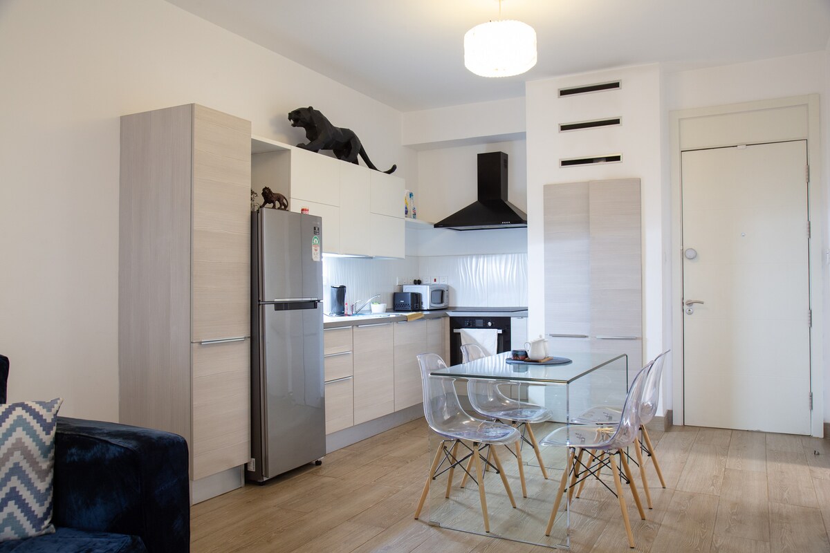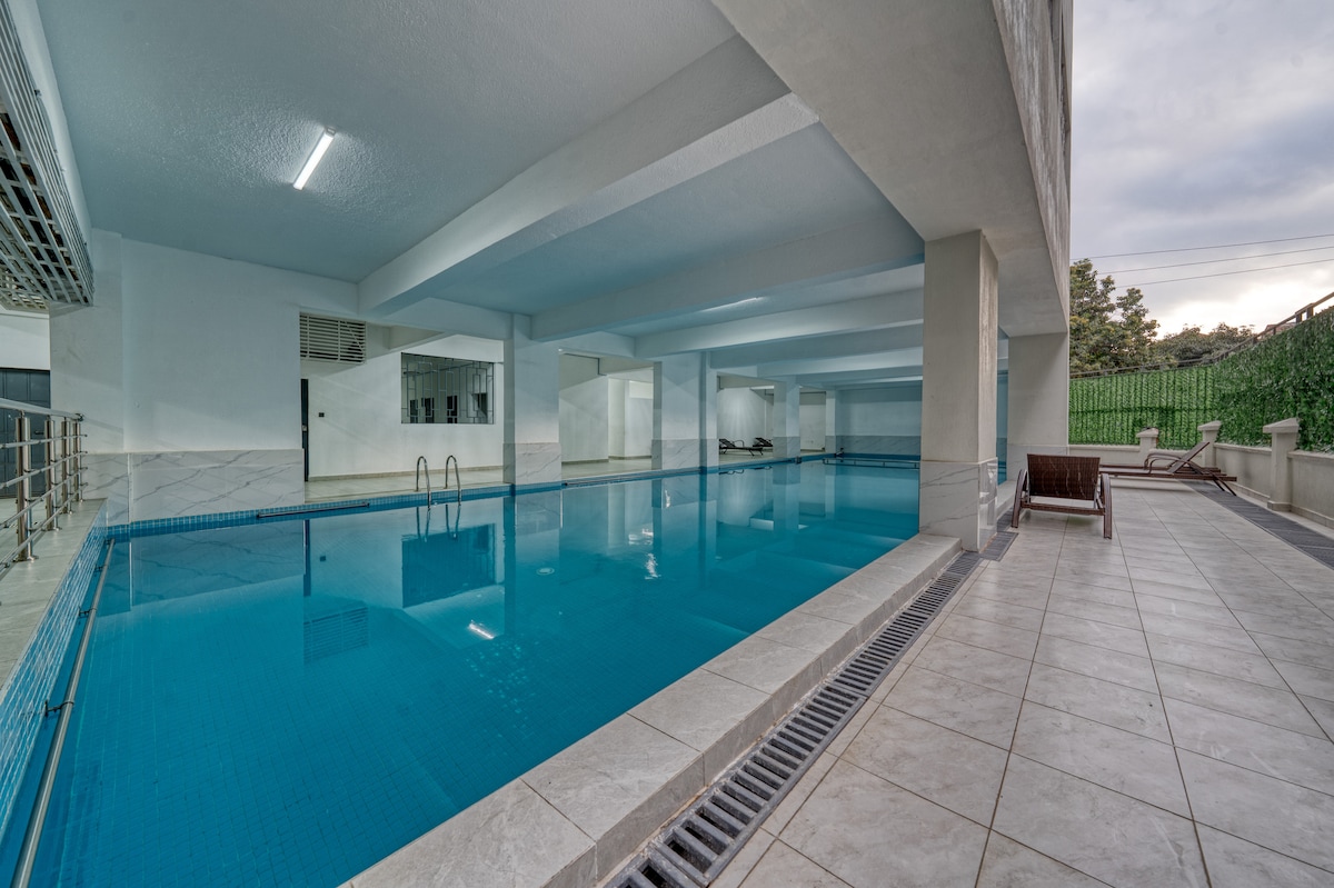 Relájate en este refugio único y tranquilo de 1 cama. Es un departamento nuevo de 1 cama;limpio con una cama tamaño queen. Está equipado con excelentes duchas de agua caliente, cómodos sofás modernos e internet de alta velocidad. Encontrarás una cocina bien equipada, un concepto minimalista y unas vistas impresionantes de la ciudad. Cuenta con un generador de respaldo completo, una piscina climatizada, un gimnasio de última generación y un área de juegos para niños. La ubicación también es excelente con transporte gratuito.