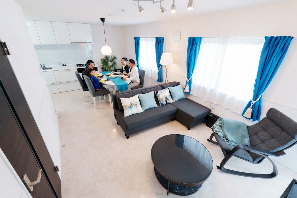 Esta casa independiente se encuentra en Yomitan Village, en la prefectura central de Okinawa.A unos 50 minutos en coche del aeropuerto.Cerca se encuentra la popular zona turística con Hotel Nikko Alivira, Hoshino Resort Banta Cafe, Zampa Golf Club, paseos a caballo, vidrio Ryukyu e instalaciones de experiencia cerámica. Casa 3LDK en una zona residencial tranquila con vistas al mar.Espacio completamente privado.Estacionamiento para 2 coches. Todas las habitaciones son para no fumadores Alquiler gratuito de estufa para barbacoa y sillas de exterior.Hay una manguera de ducha en la puerta. Está a unos 5 minutos en coche de Super Kanehide, Marudai Supermarket, Max Value y una tienda de conveniencia, lo cual es muy cómodo. ¡Las familias con niños pequeños son bienvenidas!Está equipada con una cuna para niños y una silla para niños.No hay espacio entre la cama y la pared en cada habitación, por lo que no hay que preocuparse por caerse.Ideal para familias y viajes en grupo. A 10 minutos en coche, se puede llegar a la playa de Nirai, las ruinas del castillo de Zakimi, Yachimunnosato, el faro del cabo Zanpa, la playa de Manza y el cabo Maeda, donde se encuentra la Gruta Azul.American Village y Okinawa Arena están a unos 30 minutos, Jungle Aquarium está a unos 60 minutos y Churaumi Aquarium está a unos 80 minutos.¡Ubicación súper conveniente con un montón de experiencias en la naturaleza, actividades y tiendas! Está equipado con lavadora, secadora, wifi y escritorio, y es adecuado para estancias largas.