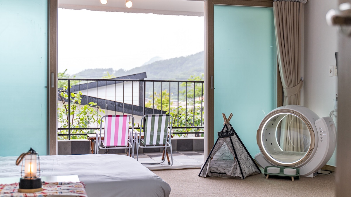 <공스테이>방학특가/에어바운스 무료대여/넓은거실/오션뷰/불멍/루프탑/애견동반/캠핑/통창감성