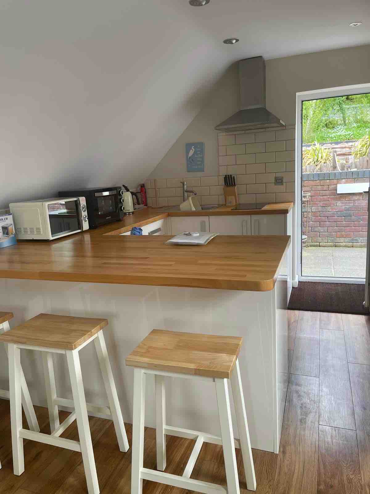 Un apartamento de planta abierta, luminoso y espacioso, totalmente independiente, con ducha a ras de suelo y WC separados. Cocina y barra de comedor/desayuno con pequeña sala de estar y TV. Todo tu propio espacio privado cerca de una tranquila y acogedora ciudad costera. Aparcamiento privado con escalones para acceder a la entrada del edificio, situado sobre el garaje doble del propietario. Mesa exterior y sillas. Entrada segura con llave al apartamento. Dormitorio con lujosa cama de matrimonio, cómodas junto a la cama, un gran armario empotrado y un espejo de pared.