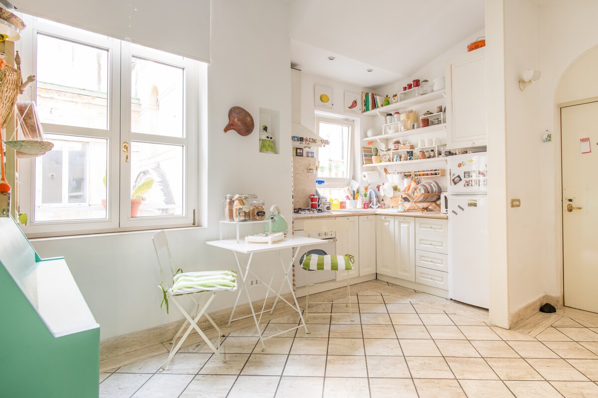 Departamento luminoso de 100 metros cuadrados recientemente renovado, situado en el tercer piso de un edificio antiguo sin ascensor, situado en el corazón de los barrios españoles, a pocos pasos del centro histórico. La casa consta de: 3 habitaciones dobles con baño privado, cocina/sala de estar común, lavandería con lavadora disponible para los huéspedes, terraza equipada con 130 metros cuadrados con cocina incorporada y acceso directo desde la casa y vistas a los tejados de Nápoles, el Vesubio y la Certosa de San Martino.