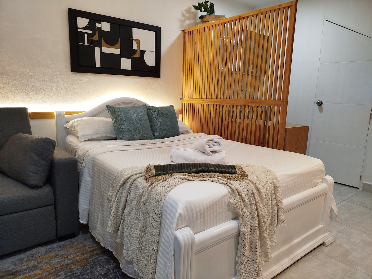 Espectacular apartamento 40 m2, con cama King y una sofá cama, aire acondicionado, caja de seguridad, cocina completamente equipada, electrodomésticos, lavadora-secadora, WIFI de alta velocidad y Smart tv de 55". Aptos ubicados en diferentes pisos del edificio. A tu llegada tendrás disponible 2 botellas de agua, café y sal incluido en tu estadía sin cargo adicional.
