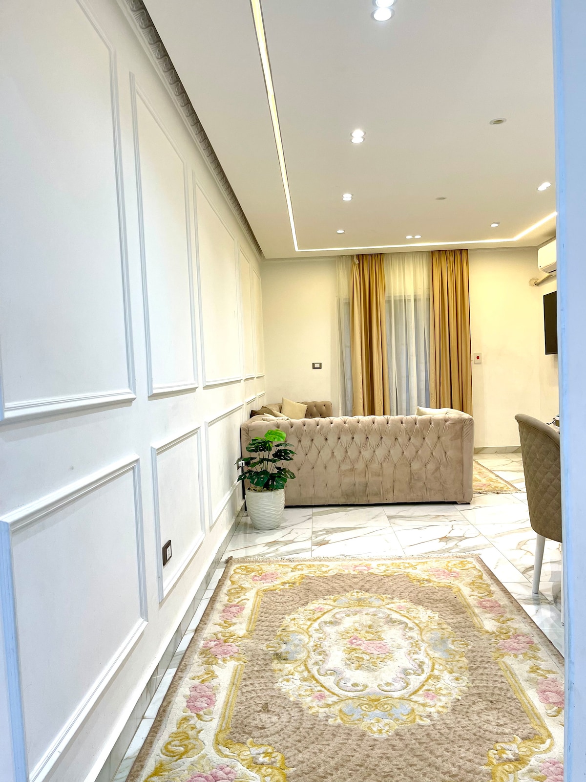 ¡Bienvenido a mi encantador apartamento de lujo! Mi apartamento está ubicado en un complejo seguro de lujo con un amplio jardín muy bonito y una zona infantil. Disfruta de la elegancia moderna de 2 dormitorios, aire acondicionado completo y comodidad. Elegante sala de estar, cocina totalmente equipada. Te encantará la decoración elegante y el ambiente acogedor, lo que lo convierte en el hogar perfecto lejos de casa. * Internet de alta velocidad. * A 10 minutos del centro de la ciudad y del centro comercial Almaza. * A 15 minutos del centro comercial Cairo Festival. * A 15 minutos del aeropuerto. ¡Reserva ahora para disfrutar de una estancia excepcional!
