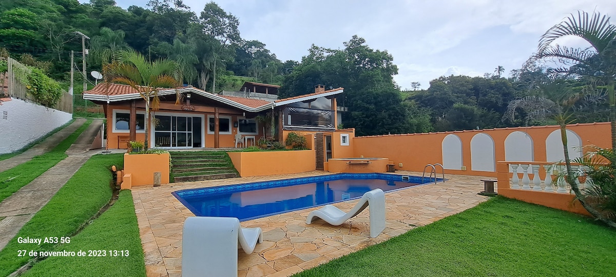 Nunca olvidarás tu estancia en este lugar romántico y sorprendente. - Piscina 100 % privada - Hidromasaje climatizado. - Cocina completa. - Espacio romántico con chimenea - Parrilla de carbón. - Balcón con vistas a la montaña. - Garage Privativa - Puerta automática - Mercado, panadería y farmacia a 600 metros. - Barrio 100 % pavimentado - TV con transmisión en vivo registrada - Sillas de sol y tumbonas - Freidora de aire, licuadora, máquina de fondue, coctelera, batidora, sandwichera, cafetera, dulce gusto...