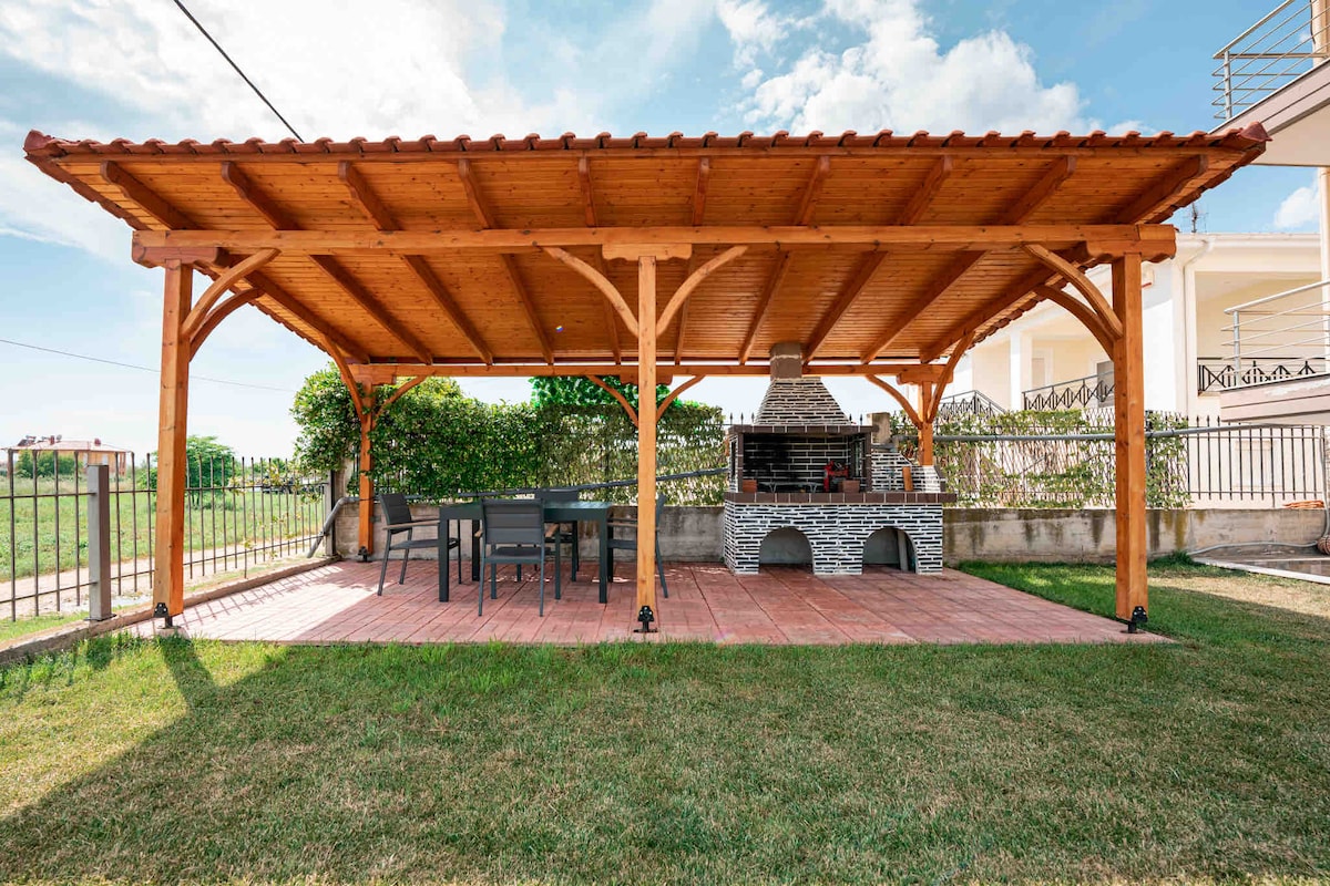 La casa está a 30 km del centro de Tesalónica. Casa independiente con jardín, porche, barbacoa, nevera, estufa eléctrica de cerámica con horno, horno microondas, cafetera, lavadora, plaza de aparcamiento. A diez minutos a pie del mar y a cien metros de una parada de autobús. No hay discriminación racial, social o de otro tipo, acepta mascotas. Ideal para familiares o amigos.