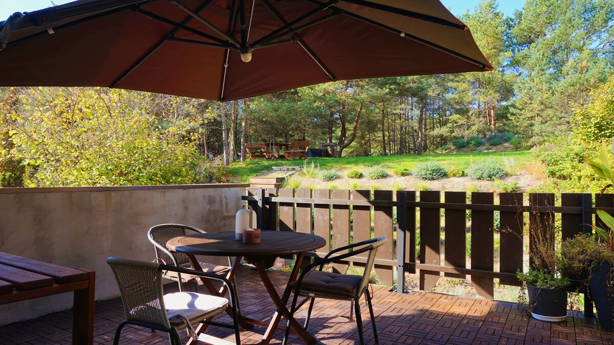 El nuevo departamento está situado en el bosque de pinos donde se conectan la laguna de Curonia y el bosque. Te encantará por la fusión de modernidad, comodidad y comodidad. Por las noches podrás ver espectaculares puestas de sol desde la gran terraza que está rodeada de pinos gigantes y la compañía de animales del bosque. Nuestro lugar es perfecto para parejas, aventureros solitarios, familias (con hijos) y amigos peludos (mascotas).