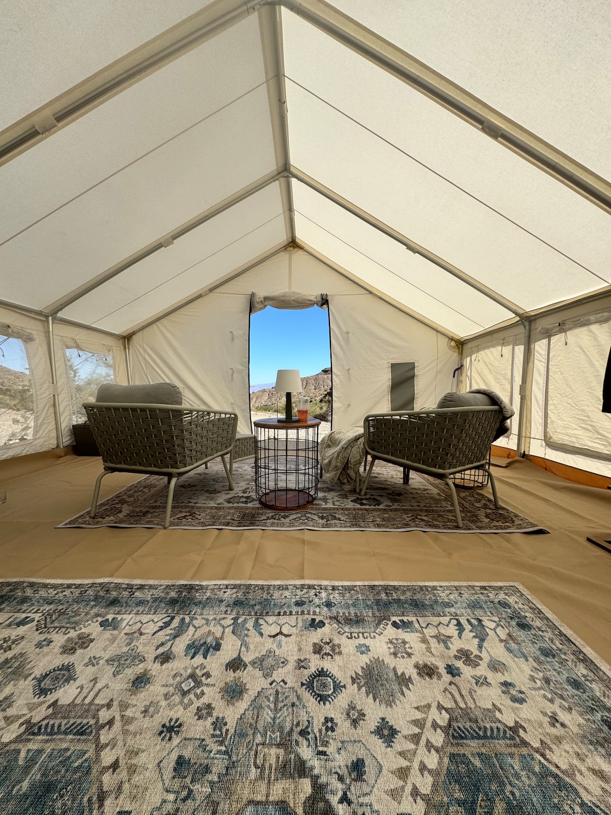 El orgullo y la alegría del desierto. Disfruta de los sonidos de la naturaleza cuando te hospedes en este lugar único. Una tienda de campaña de lona Whiteduck de 400 pies cuadrados tiene numerosos servicios. Dos camas tamaño queen con cómodo colchón de espuma viscoelástica y sábanas de lujo. Una pintoresca cocina pequeña para preparar refrigerios y comidas. ¡Una sala de estar separada con acogedoras tumbonas frente a la vista perfecta al amanecer! Para cocinar, ¡simplemente trae tu propia leña o carbón vegetal para la chimenea! ¡Coge nuestra lista de qué empacar antes de tu llegada!