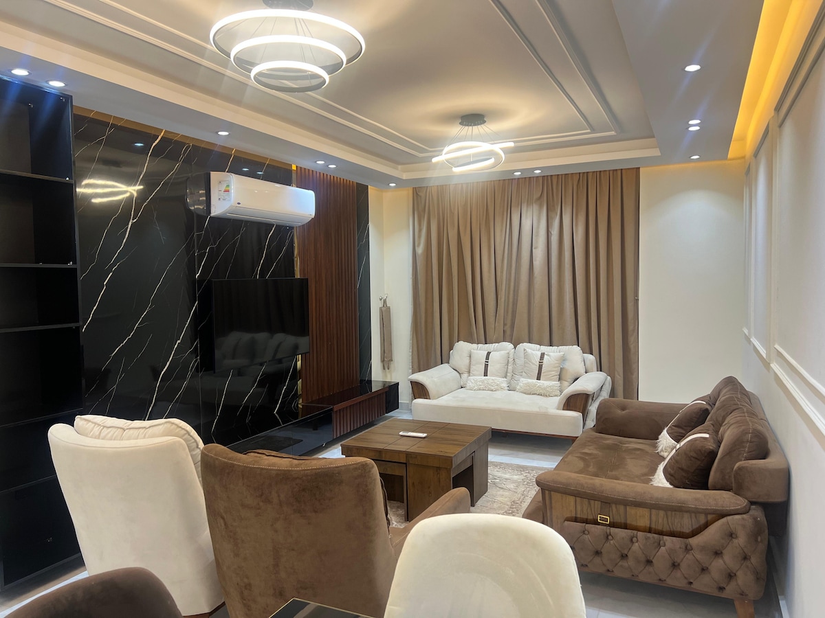 Fantástico apartamento totalmente amueblado de 3 dormitorios dobles grandes, ubicado en New Cairo, a 25 metros del aeropuerto internacional de El Cairo. Aeropuerto en una hermosa villa con entrada privada en una zona muy prestigiosa donde los huéspedes pueden relajarse y disfrutar del ambiente egipcio. Cuenta con una amplia y bonita sala de estar, cocina totalmente equipada, balcón grande con vistas al paisaje, una habitación principal con cama tamaño queen con baño privado y ducha. Los otros 2 dormitorios tienen 4 camas individuales, un baño grande y una bañera.