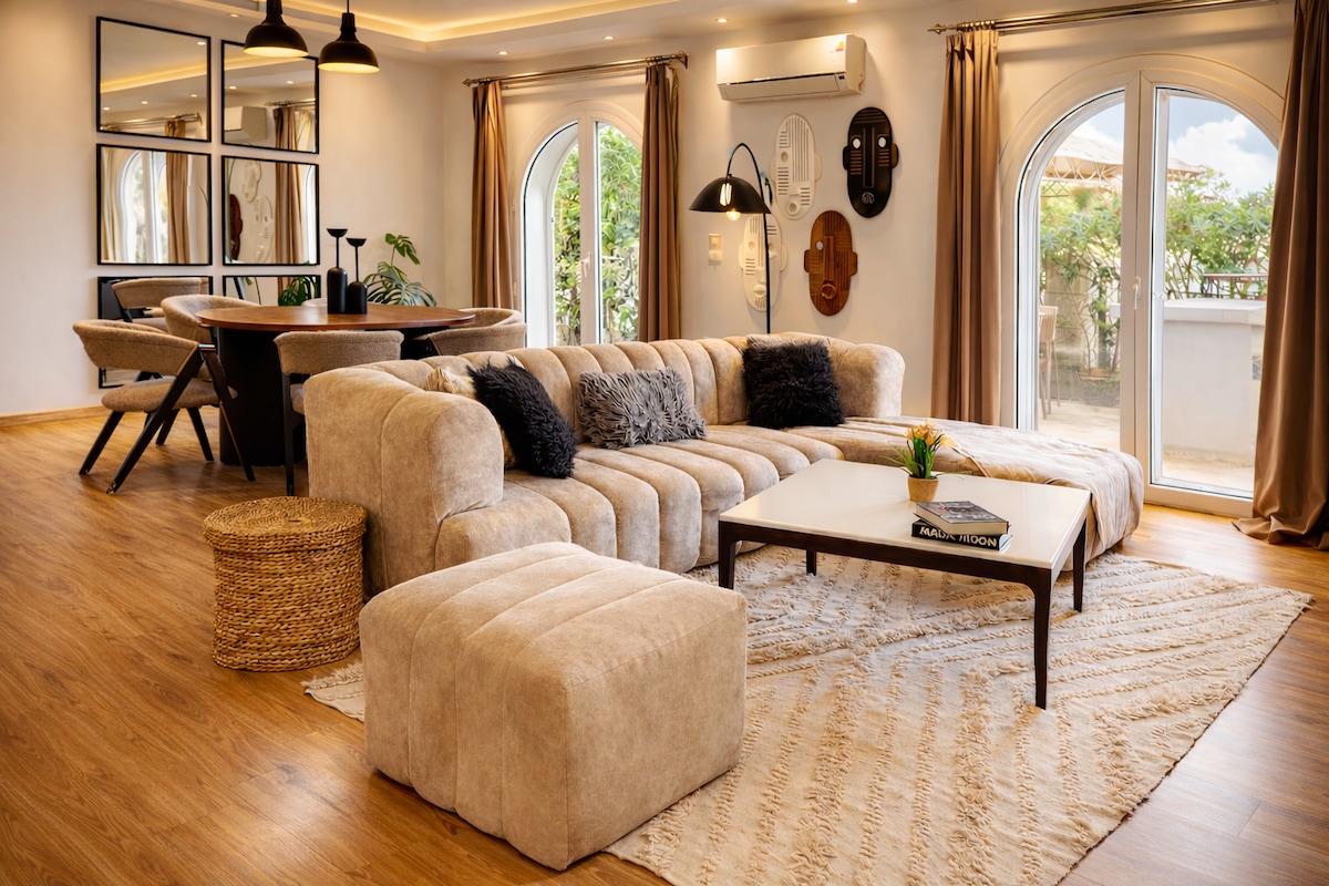 Disfruta del lujo boho moderno en este nuevo apartamento (octubre de 2025) ubicado en la prestigiosa West Golf Extension, New Cairo, a pocos minutos de 5A Walkway, Cairo Festival Mall y los vibrantes lugares de Katameya. Disfruta de un dormitorio principal presidencial, 4 televisores inteligentes, aire acondicionado oculto, persianas eléctricas y electrodomésticos completamente nuevos en un espacio luminoso y elegante. Perfecto para los huéspedes que buscan comodidad, estilo y una experiencia de lujo en El Cairo.