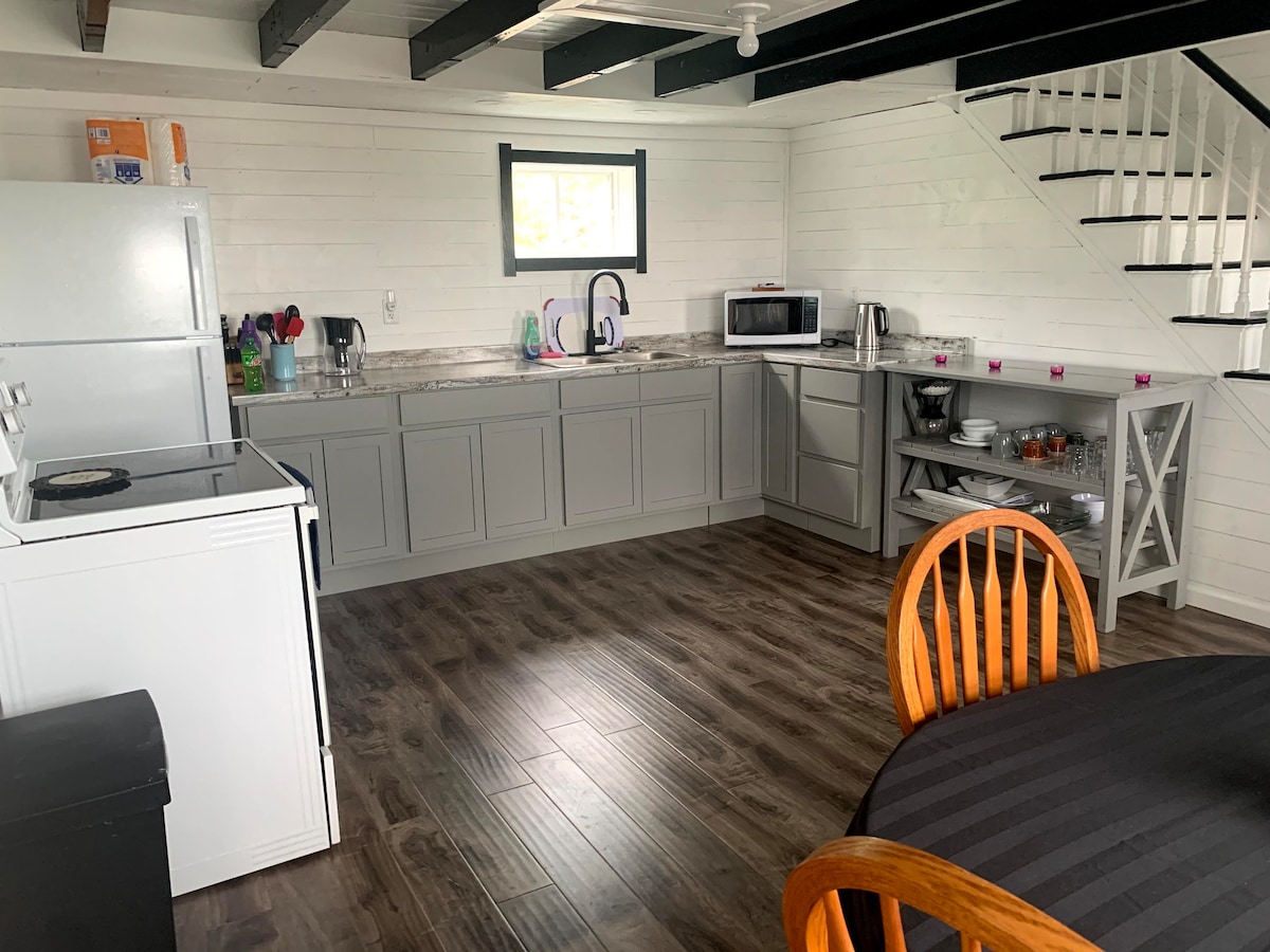 CONCEPTO ABIERTO unidad de un dormitorio con una cama tamaño queen y un sofá cama doble extraíble... cocina totalmente equipada... baño de 3 piezas... Internet inalámbrico... TV por cable... patio compartido... y nuestras joyas más nuevas, un sitio de fogata compartido con asientos adirondack y una bañera de hidromasaje compartida para 7 personas, ambos ubicados en el patio trasero... alquiler diario, semanal o mensual... servicio de lavandería disponible... mascotas bienvenidas... cerca del supermercado local, licorería, pub local, restaurantes, farmacia, parque infantil con almohadilla de chapoteo...