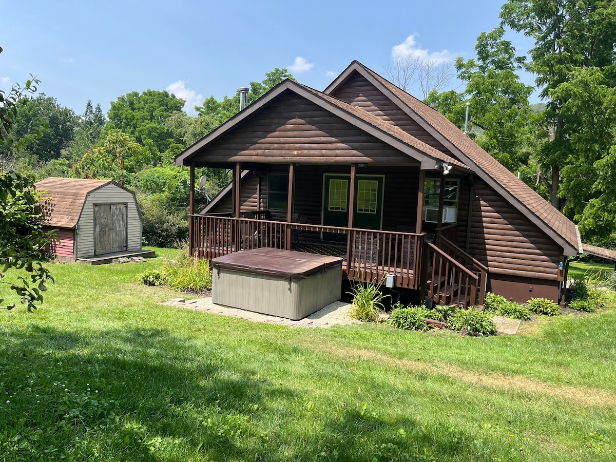 Una acogedora cabaña a orillas de Cayuta Creek, inmersa en la belleza natural. Ubicado en nuestro huerto orgánico y sidrería de 75 acres, está a poca distancia en coche de Ithaca, Watkins Glen, bodegas de Finger Lakes, parques estatales y gargantas. La naturaleza te rodea: el agua que corre, el coro de las ranas, los castores que nadan, las águilas pescadoras que pescan truchas. Disfruta pasando el rato y comiendo en una terraza envolvente con vistas al agua. Fácil acceso, sensación de estar lejos de todo.*Inodoro de compostaje*