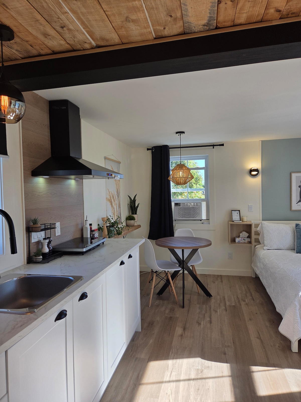 Su pie en tierra en Matane se encuentra en el centro de la ciudad., cerca del río y el río. es un bonito estudio luminoso a estrenar con lo necesario para cocinar: nevera, placa de inducción de 2 fuegos , horno de convección portátil de gran capacidad, así como todas las comodidades. Una cama queen, espacio de trabajo con wifi de alta velocidad y un televisor inteligente. En temporada tiene acceso a la barbacoa, al patio trasero y a la chimenea exterior.