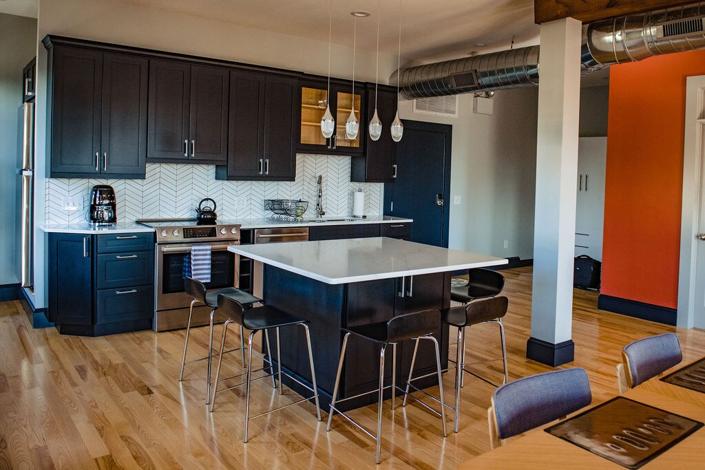 Loft luminoso, moderno y elegante con paredes de ladrillo visto originales en el centro de Newport/zona de Broadway. Recién reformado con planta abierta, baño/cocina de diseño y electrodomésticos nuevos. Techos altos, suelos de madera nuevos, 9 ventanas extragrandes, diseño moderno. @ 1650 pies cuadrados (promedio La habitación del Hampton Inn es de aprox. 350 pies cuadrados). 1 dormitorio privado con cama queen, 1 cama Murphy (doble), 1 litera. Una de las tres unidades disponibles en el mismo edificio: airbnb.com/h/gritspearl airbnb.com/h/gritsloft