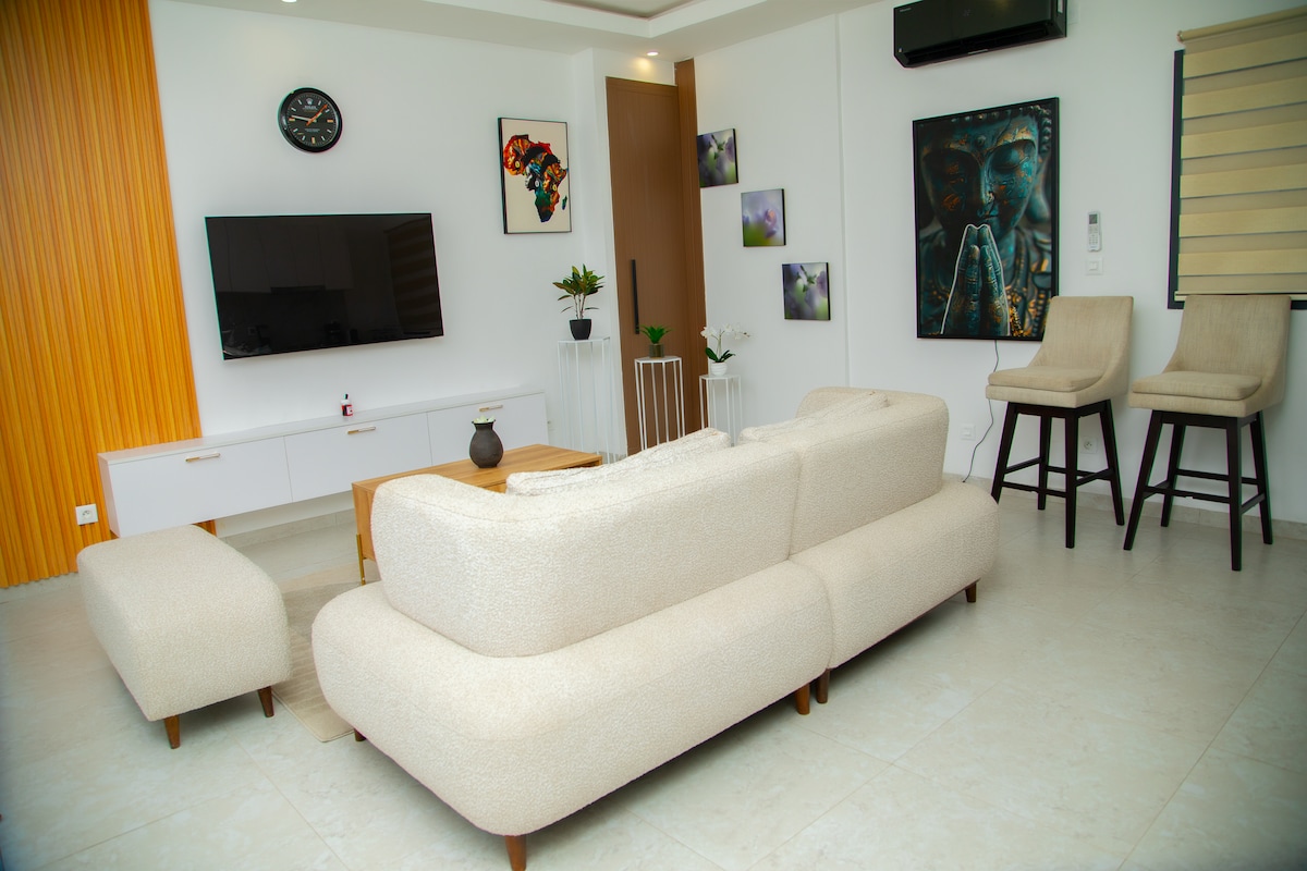 Séjournez dans un appartement moderne et elegant situé au coeur des Almadies, juste en face de l’Hôtel BOMA. Idéal pour les voyageurs en quête de confort et de tranquillité, cet appartement propose une Wi-Fi haut débit, une Smart TV et une cuisine entièrement équipée. L’immeuble offre une sécurité 24h/7, une salle de sport, un grand salon commun, un ascenseur ainsi qu'un parking gratuit. Profitez également de nos services exclusifs : Transfert à l'aéroport & Location de voiture.