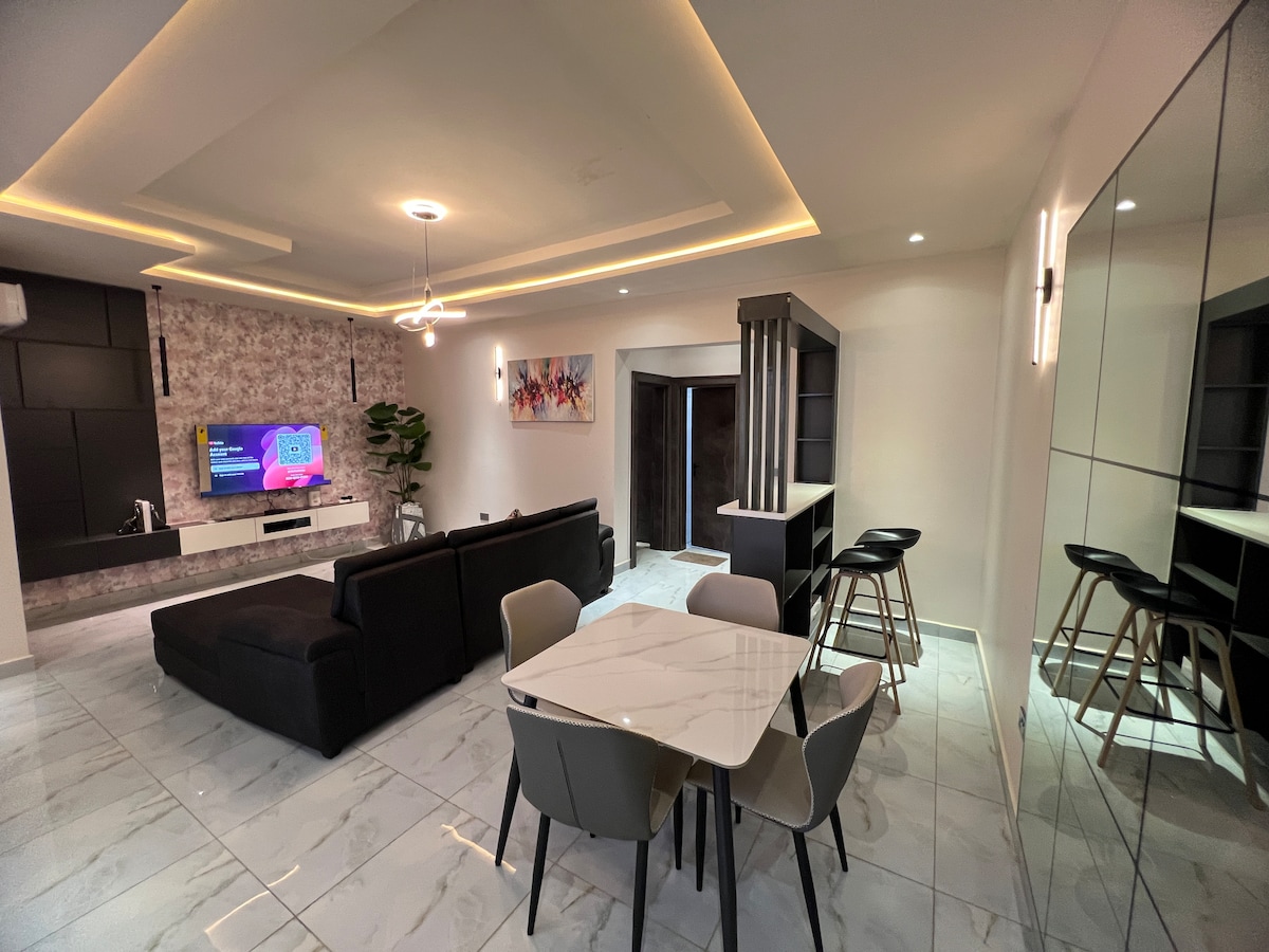 Este exquisito y lujoso apartamento con servicios está cuidadosamente escondido de la ciudad, pero accesible al centro de la ciudad. Tiene una ubicación céntrica con todas las comodidades exclusivas y el sistema de suministro de energía, como un inversor instalado y un generador que nunca falla en la alimentación de la unidad de refrigeración 12 horas por día. ofrecemos servicios de lavandería por un cargo adicional, pero el planchado es gratis. está a diez minutos de lugares como el centro comercial Novare, donde encontrarás Génesis Cinema, Shoprite, spa, barbería,restaurante,etc.
