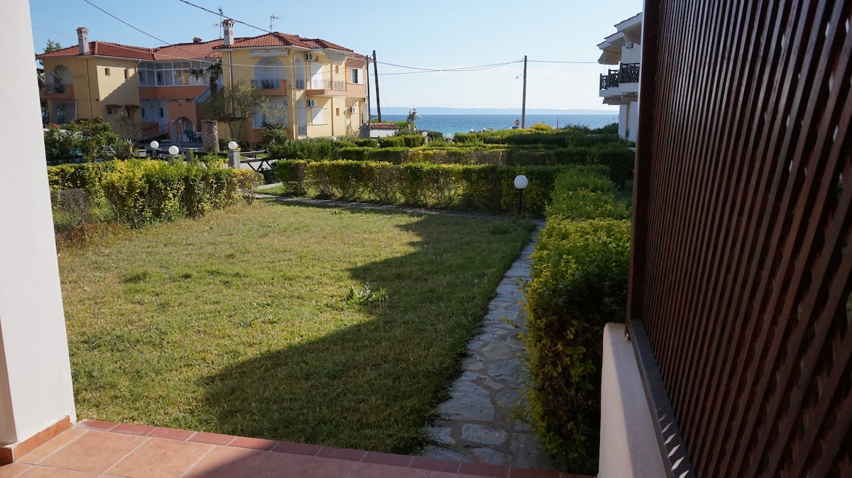 Una excepcional villa de verano de 55 metros cuadrados, bellamente equipada y amueblada con dos dormitorios, 2 baños (ducha interna y externa), así como una sala de estar y cocina. Contra Mare constituye un destino ideal rodeado por un gran patio verde a solo 60 metros de la hermosa Trani Ammouda, que ha recibido el estatus de playa «Bandera Azul» frente a una impresionante vista del monte Athos. ¡Ideal para unas relajantes vacaciones de verano en familia sin preocupaciones!