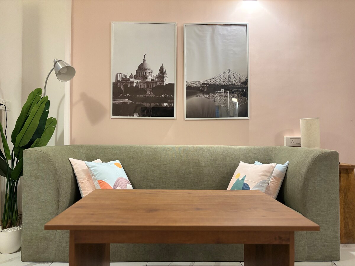 Welcome to your comfortable home in Greenfield City, Behala. This spacious 2BHK apartment is perfect for families, couples, and business travelers looking for a relaxed and well-connected stay. Both bedrooms are fully air-conditioned, ensuring a comfortable sleep after a long day. The living room features a large 50-inch Smart TV, a comfortable sofa, and a warm, inviting setup to unwind or enjoy your favorite shows. A dedicated dining table makes it easy to enjoy meals together.
