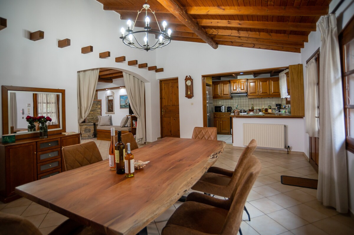 Das traditionelle Steinhaus grenzt an einer Seite an die natürliche Felswand. Das Bad ist ganz in den Fels hinein gebaut. Das ergibt ein ganz spektakuläres Wohngefühl und den Eindruck, mitten in der Natur zu sein. Die Terrasse hat eine wunderschöne Aussicht auf das Meer, den Strand von Fytema und die Berge von Messaria. Die Wohnung ist 2023 mit ökologischen Materialien im traditionellen Stil ausgebaut worden. Zum Strand sind es nur 200 m.