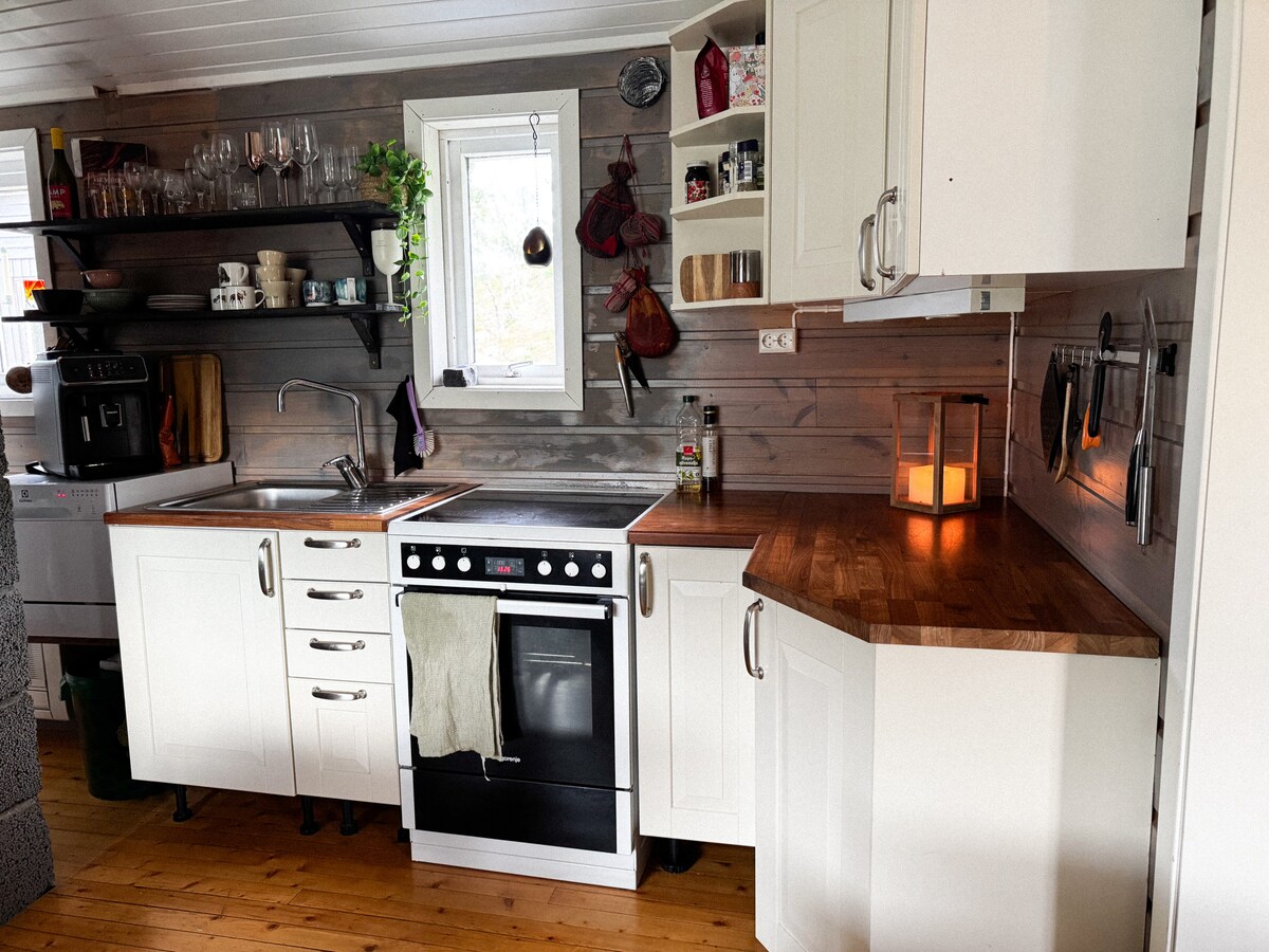 Bienvenido a nuestra cabaña, situada en una zona tranquila junto a un lago. La cabaña tiene vistas al lago, y se puede experimentar la aurora boreal y el sol de medianoche desde la ventana de la sala de estar. La zona ofrece diversas oportunidades para practicar senderismo, actividades al aire libre y experiencias durante todo el año. No dudes en pedirnos consejos :) ¡TEN EN CUENTA! La litera está parcialmente abierta y no es adecuada para niños pequeños. Los niños pequeños pueden usar el dormitorio, el sofá cama en la sala de estar o un colchón extraíble. La cabaña tiene un depósito de agua caliente de 120 litros, hay agua caliente para 3 - 4 personas.