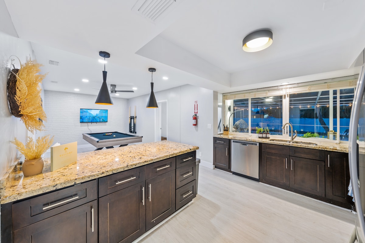 Villa renovada de 4 dormitorios cerca de Hallandale Beach con nueva piscina, jacuzzi y patio trasero cercado. 3 habitaciones tienen camas tamaño queen, y la cuarta funciona como sala de cine/juegos con futbolín y sofá cama. La cabaña cubierta incluye ventiladores, sofá, TV, chimenea, parrilla, tumbonas y jacuzzi. Interior: cocina completa, chimenea interior, espacio de trabajo, wifi y streaming. Aparcamiento en el sitio, lavandería y tarifa adicional para mascotas. Cerca del centro comercial Aventura, Gulfstream Park, Hard Rock Casino y Hollywood Beach Boardwalk.