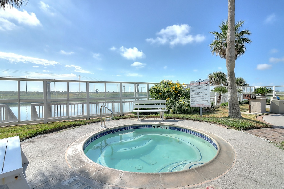 Bienvenido a nuestro Gulf Coast Condo, tu hogar lejos de casa en la maravillosa isla North Padre. Disfruta del café por la mañana o del vino por la noche desde nuestro balcón privado del segundo piso con vistas al mar y la brisa de la playa. Nuestro apartamento tiene capacidad para cuatro personas con espacio adicional adecuado para un colchón inflable. Durante tu estancia, disfruta de un corto paseo de cinco minutos hasta la playa de Whitecap, o puedes elegir una comodidad en el lugar como la piscina/bañera de hidromasaje, muelle/estanque de pesca privado, sauna, cenador con parrilla o gimnasio. También ofrecemos cable y wifi.